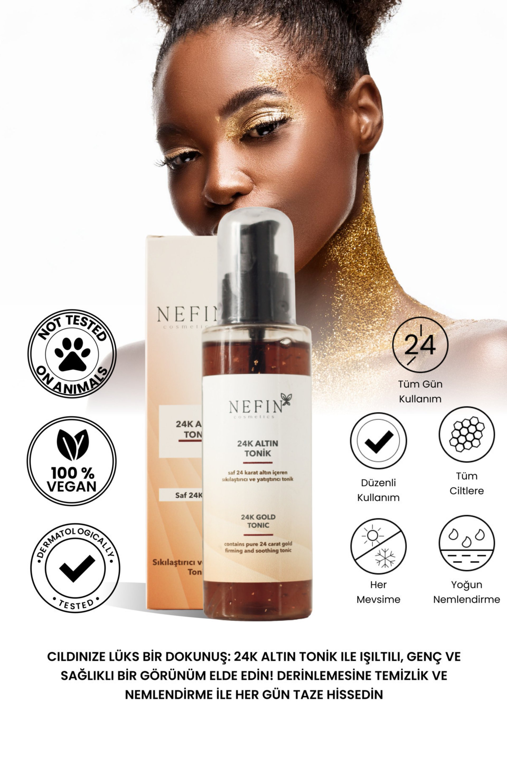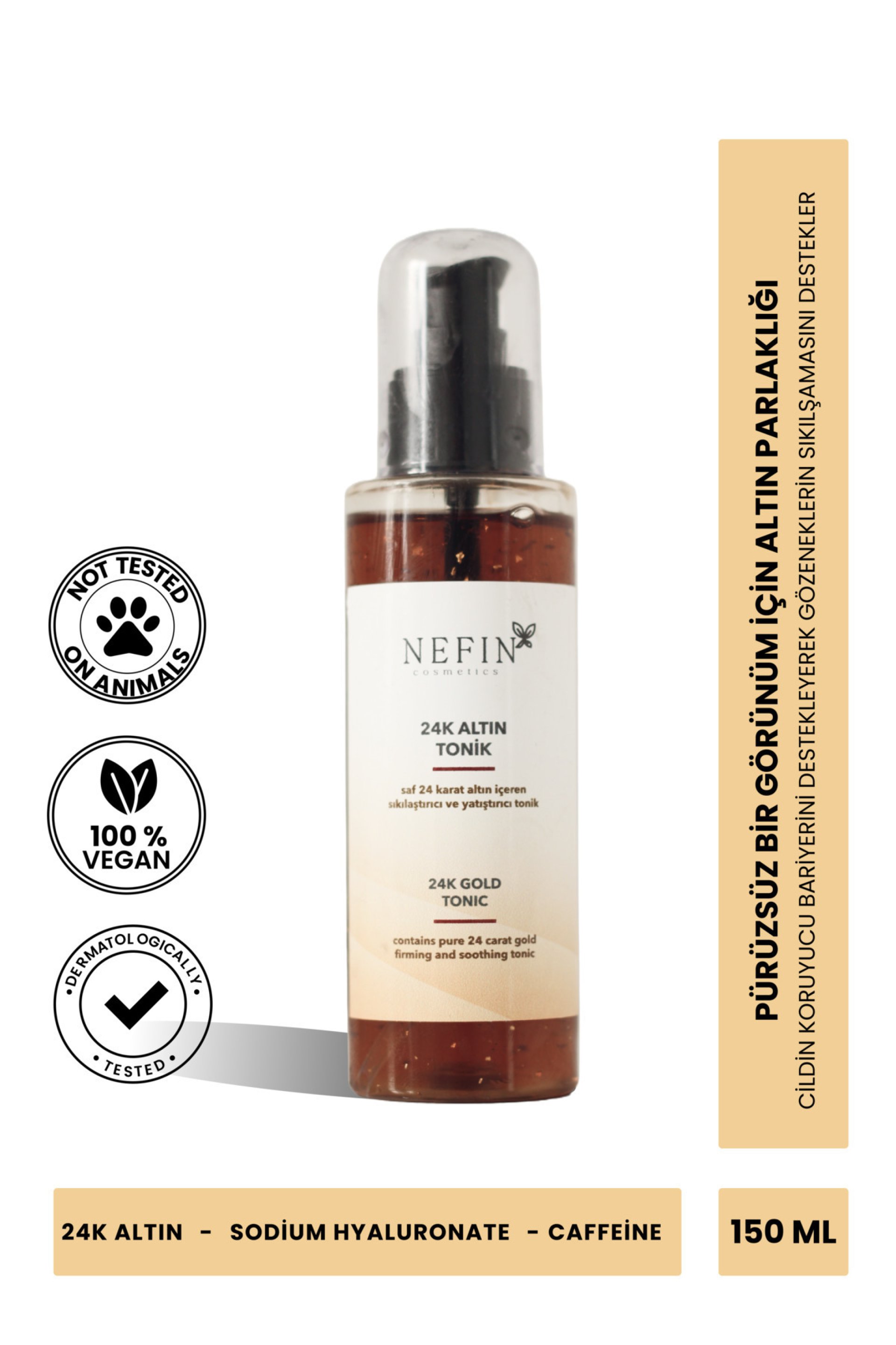 24K Altın Tonik, 24K saf altın, escin, gliserin, ruscus aculeatus kök ekstresi, centella asiatica içerir. Cildin koruyucu bariyerini destekler, gözenekleri sıkılaştırır ve pürüzsüz bir görünüm sağlar.