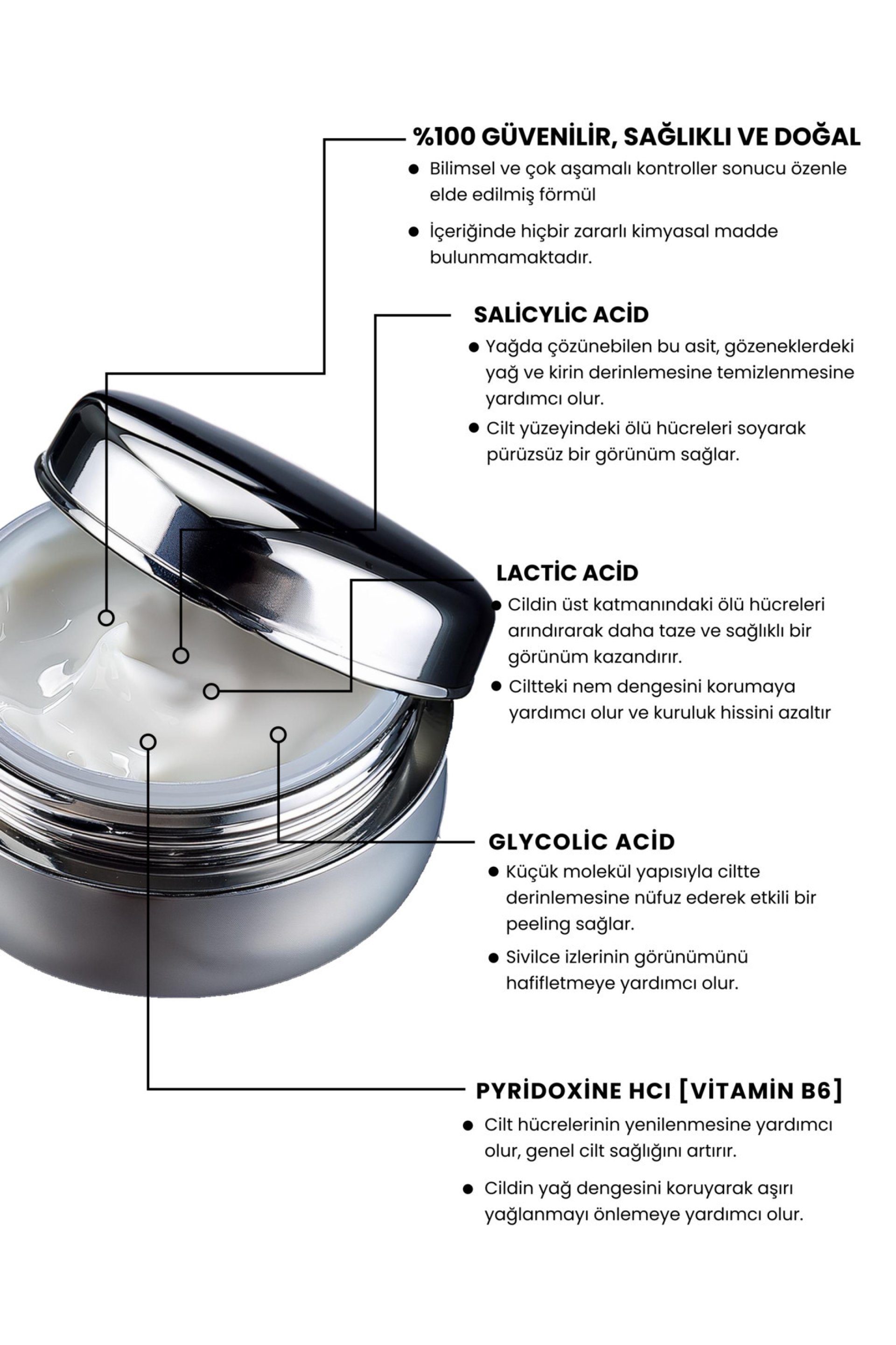 Salicylicacid ve Lacticacid: Gözenekleri temizler, ciltteki yağı dengeleyerek sivilce ve siyah nokta oluşumunu azaltır.