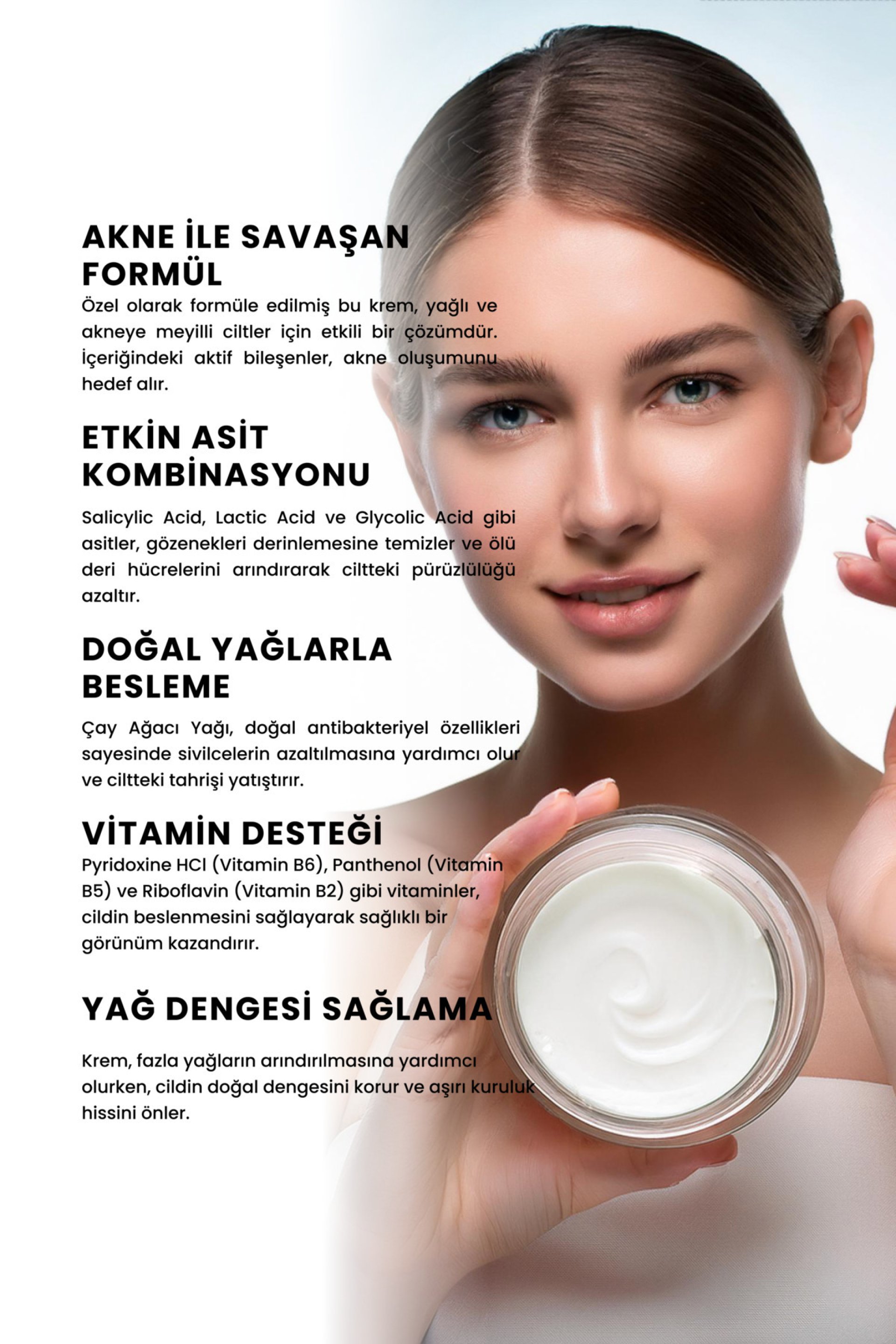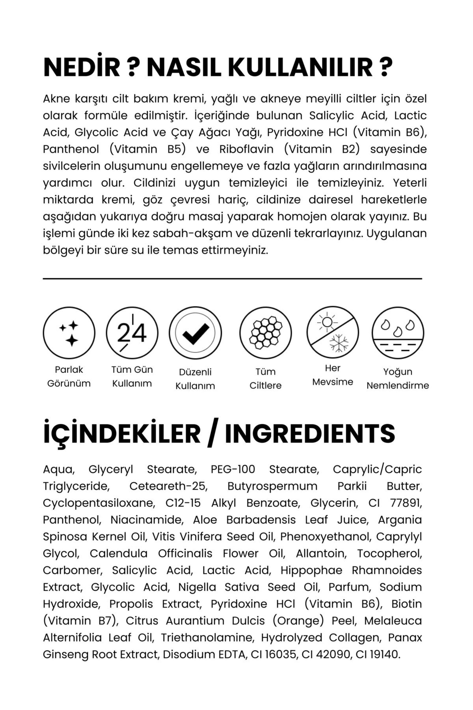 Akne ve Siyah Nokta Karşıtı Cilt Bakım Kremi, yağlı ve akneye eğilimli ciltler için özel olarak formüle edilmiştir. Salicylicacid, niacinamide, lacticacid ve çay ağacı yağı gibi bitkisel içeriklerle zenginleştirilmiş olan bu cilt bakım ürünü, hızlı ve homojen bir etki gösterir. Sebum dengesini düzenleyerek gözeneklerin tıkanmasını önler ve sivilce ile siyah nokta oluşumunu engeller.