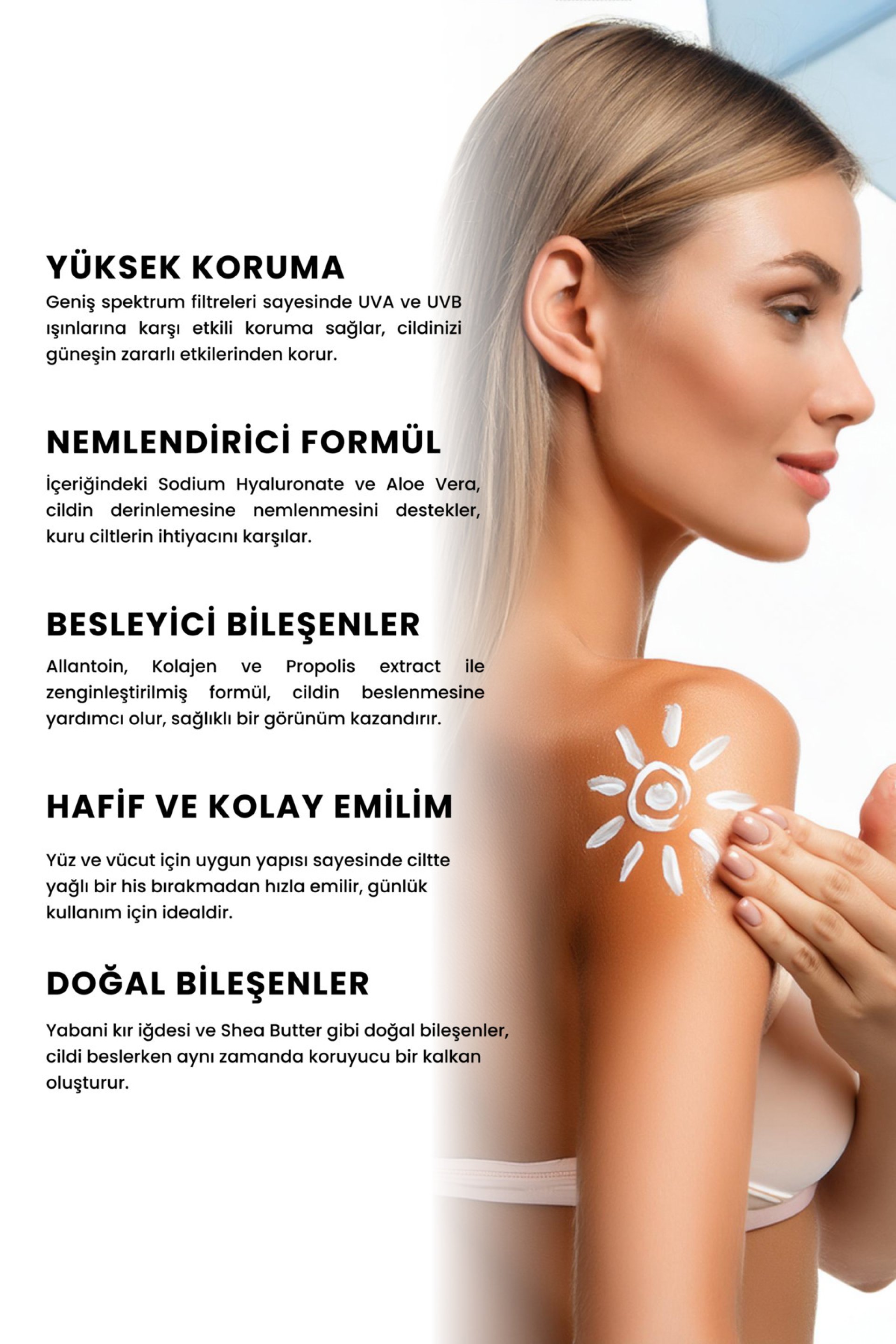- Üçlü koruma etkisi ile yaz ve kış aylarında cildi zararlı güneş ışınlarından korur; bunlar UVA filtresi, UVB filtresi ve E vitamini içerir.