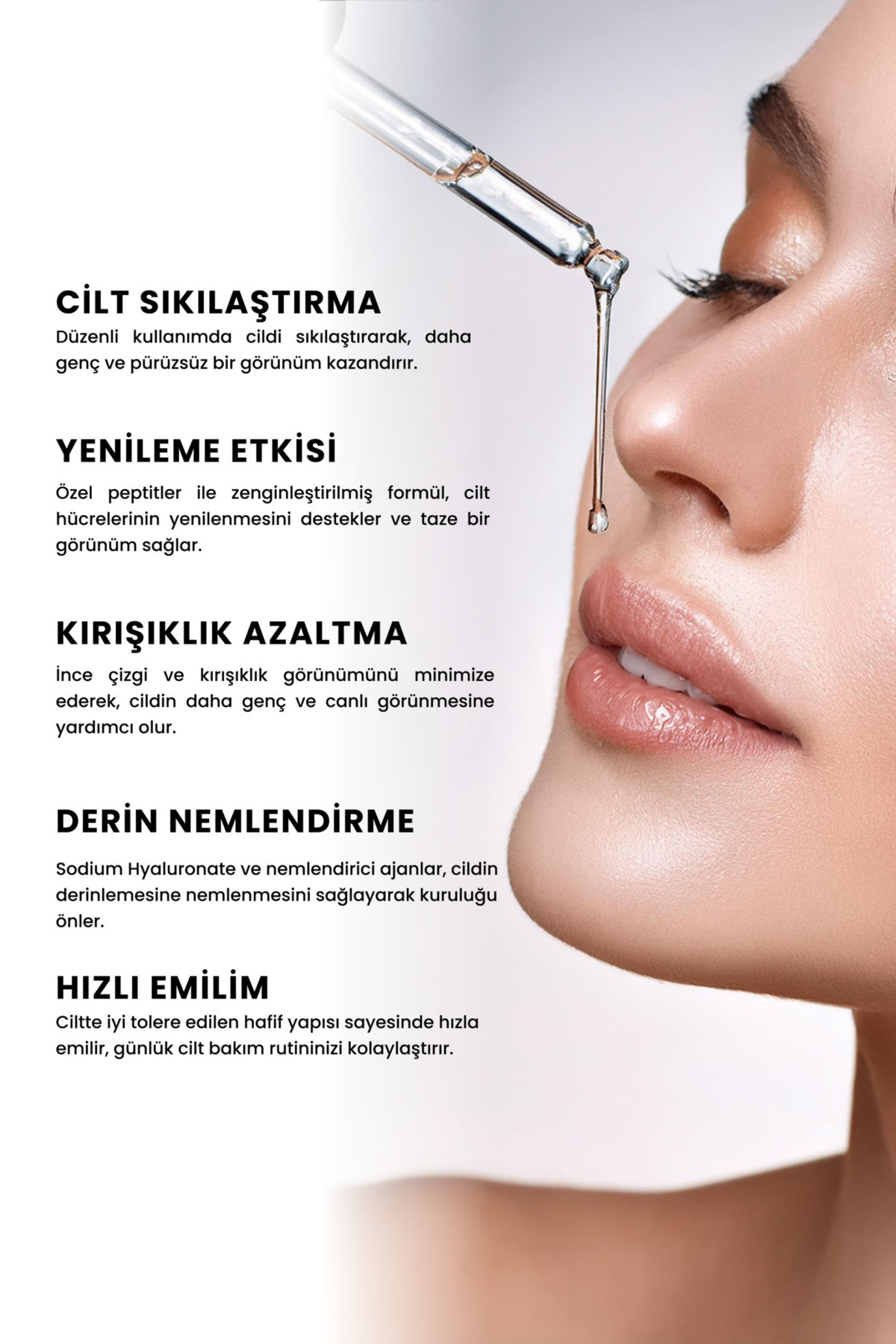 - Peptid kompleksleri ve yüksek miktarda kolajen ile cildin yenilenmesini hedefler ve yaşlanma sürecini yavaşlatır.