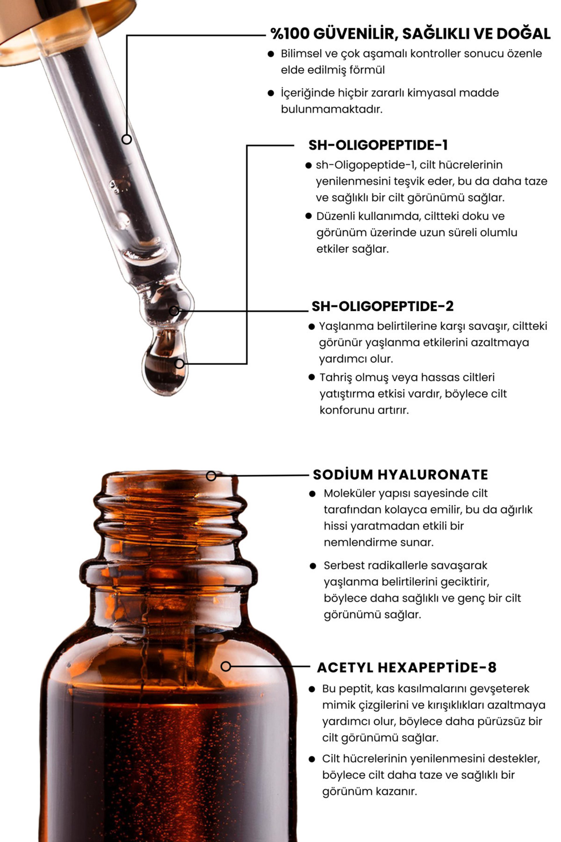 - Hidrolize Kolajen, Asetil Heksapeptid-8, sh-Oligopeptid-1, sh-Oligopeptid-2, Sodyum Hyaluronate ve nemlendirici ajanlar ile güçlendirilmiş özel formülü, cildin koruyucu bariyerini desteklemeye ve elastisitesini artırmaya yardımcı olur.